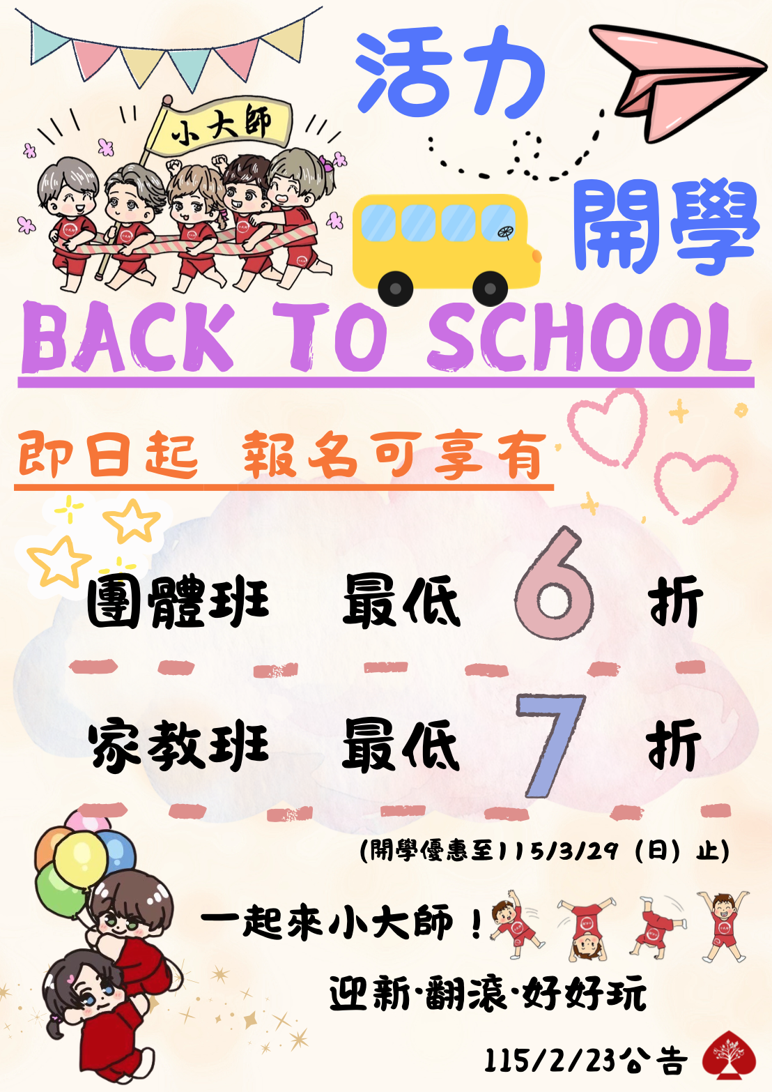「小大師開學季」 新學期 開心學 孩子想學習新的興趣和運動嗎? 小大師是您最好的選擇 安全、有趣、翻滾迎開學 即日起報名可享有 團體班 最低6折 家教班 最低7折 還有 限時寵粉活動 凡小大師學員 報名+打卡評論 可再享9折優惠 凡新生體驗後 三日內報名 可享團體班6折 家教班7折 (新生以原價活動進行使用,每人至多四期)